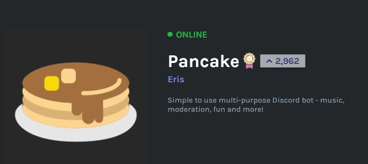 Pancake is a little different as it actually serves a few functions. It works as a music bot in a similar way to ErisBot, though with fewer options. However, it also has some images, games, and moderation capability as well. It does a little bit of everything, and is a great tool to use if you want to have a bot for each of those things, but aren’t looking to get many different ones.