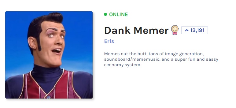 Dank Memer is a goofy bot that is just there to help your Discord have some fun. It allows for meme creation, sharing, and other fun activities. It primarily revolves around joking through popular online images.